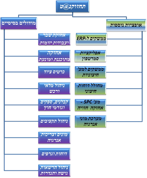- אחזקה מתוכננת ומונעת: מודול מתוחכם במיוחד המאפשר תכנון פעילויות האחזקה בהתאם למשאבי הארגון, כמו: מספר האנשים העומדים לרשות הארגון והמוקצים לפעילות זו, זמן התקן לביצוע העבודות, כמות וסוג המכשירים המטופלים, המיקום הפיזי והלוגי של הציוד המתוחזק, עונת השנה בה נדרש הטיפול ועוד. ובהתאם לכל אלה יוצרת המערכת אוטומטית צפי עבודה ריאלי.